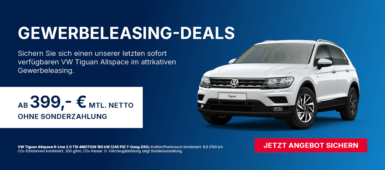 * Zzgl. Auslieferungskosten i.H.v. 1.007,56 €. Zulassungskosten berechnet der ausliefernde Betrieb separat. Ein Angebot der Volkswagen Leasing GmbH, Gifhorner Str. 57, 38112 Braunschweig, für die wir als ungebundener Vermittler gemeinsam mit Kunden die für den Abschluss des Leasingvertrags nötigen Vertragsunterlagen zusammenstellen. Bonität vorausgesetzt. Änderungen und Irrtümer vorbehalten.
