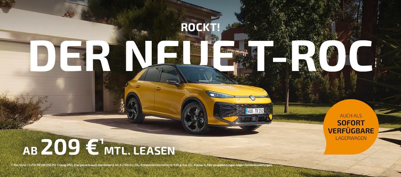 * Laufzeit 48 Monate, jährliche Fahrleistung 10.000 km. Ein Angebot der Volkswagen Leasing GmbH, Gifhorner Str. 57, 38112 Braunschweig, für die wir als ungebundener Vermittler gemeinsam mit Kunden die für den Abschluss des Leasingvertrags nötigen Vertragsunterlagen zusammenstellen. Bonität vorausgesetzt. Änderungen und Irrtümer vorbehalten. Alle Preise inkl. MwSt. Überführungskosten für die Abholung beim Händler i.H.v. 1.199,00 € berechnet der ausliefernde Betrieb separat. Zzgl. Zulassungskosten. Gültig bis 31.03.2026. Stand 02/2026