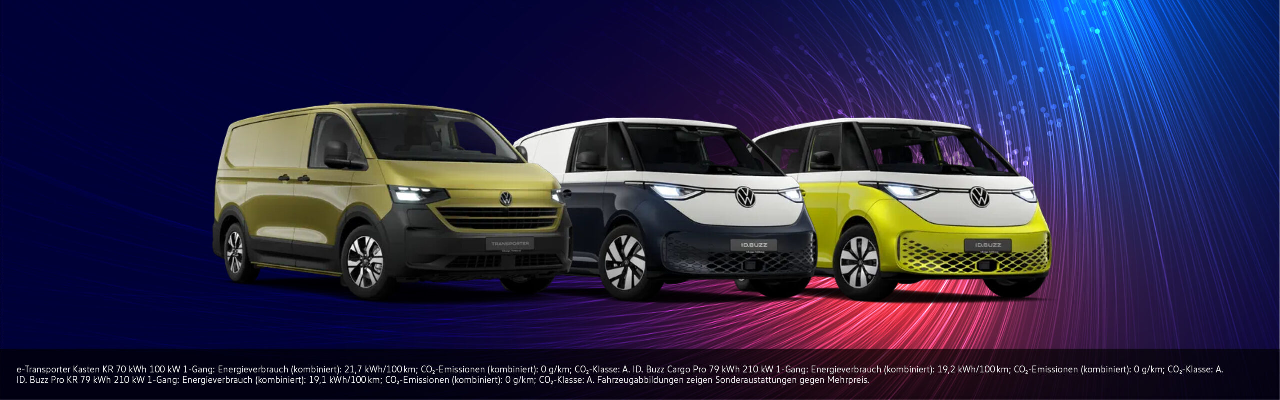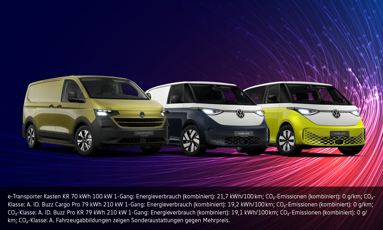 1) Für alle e-Transporter und e-Caravelle aus dem Herstellerlager gilt eine Prämie von bis zu 10.000 €. Die Kaufprämie ist gültig bis zum 29.05.2026 beim Kauf eines neufahrzeugs ohne Zulassung (Barkauf, Leasing oder Finanzierung). Es handelt sich um einen modellbezogenen, herstellerseitigen Preisnachlass, der für Neufahrzeuge ohne Zulassung aus dem Herstellerlager gewährt wird. Dieser gilt zusätzlich zu den existierenden Basiskonditionen. Die Kaufprämie in Höhe von bis zu 10.000 € ist ausschließlich bei Erstzulassungen bis zum 31.12.2026 verfügbar. Die Aktion richtet sich an private sowie gewerbliche Einzelkunden. Für gewerbliche Kunden reduziert sich die steuerliche Bewertung der Kaufprämie auf Grundlage des heranzuziehenden Bruttolistenpreises. Nicht gültig für Großkunden und Sonderabnehmer. Die Kaufprämie wird nicht im Fahrzeugkonfigurator oder in der Online-Fahrzeugauswahl auf volkswagen-nutzfahrzeuge.de angezeigt, sondern separat im Kaufvertrag durch den teilnehmenden Volkswagen Nutzfahrzeuge Partner ausgewiesen.